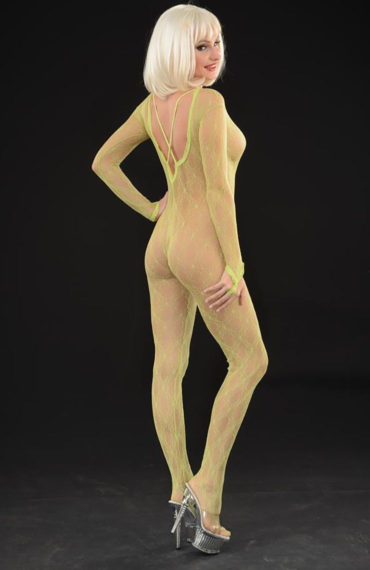 Яркий костюм-кэтсьюит из ажурной тянущейся сетки. V-образный вырез, длинные рукава и петелька на пальце.