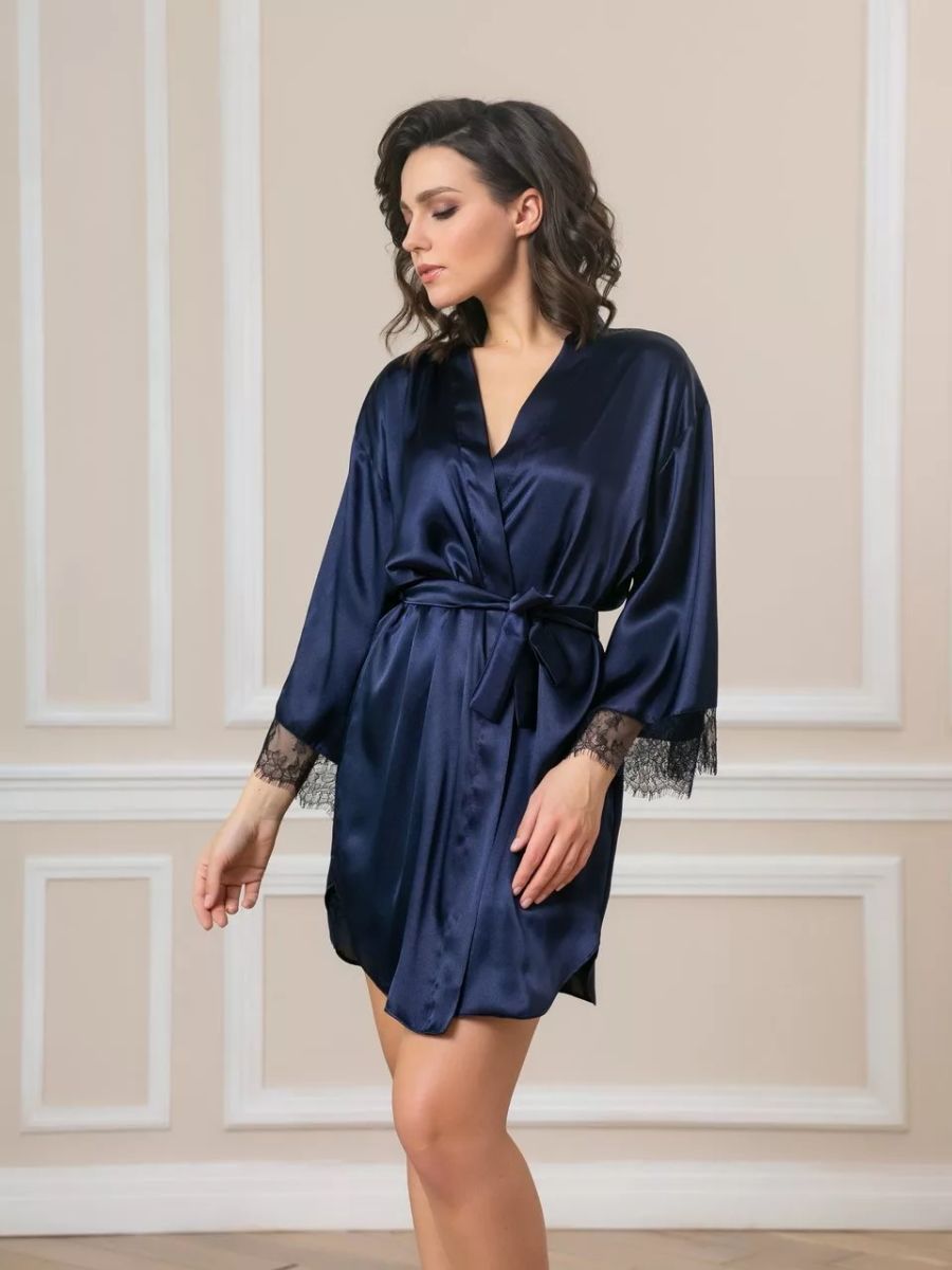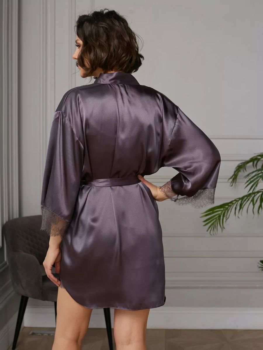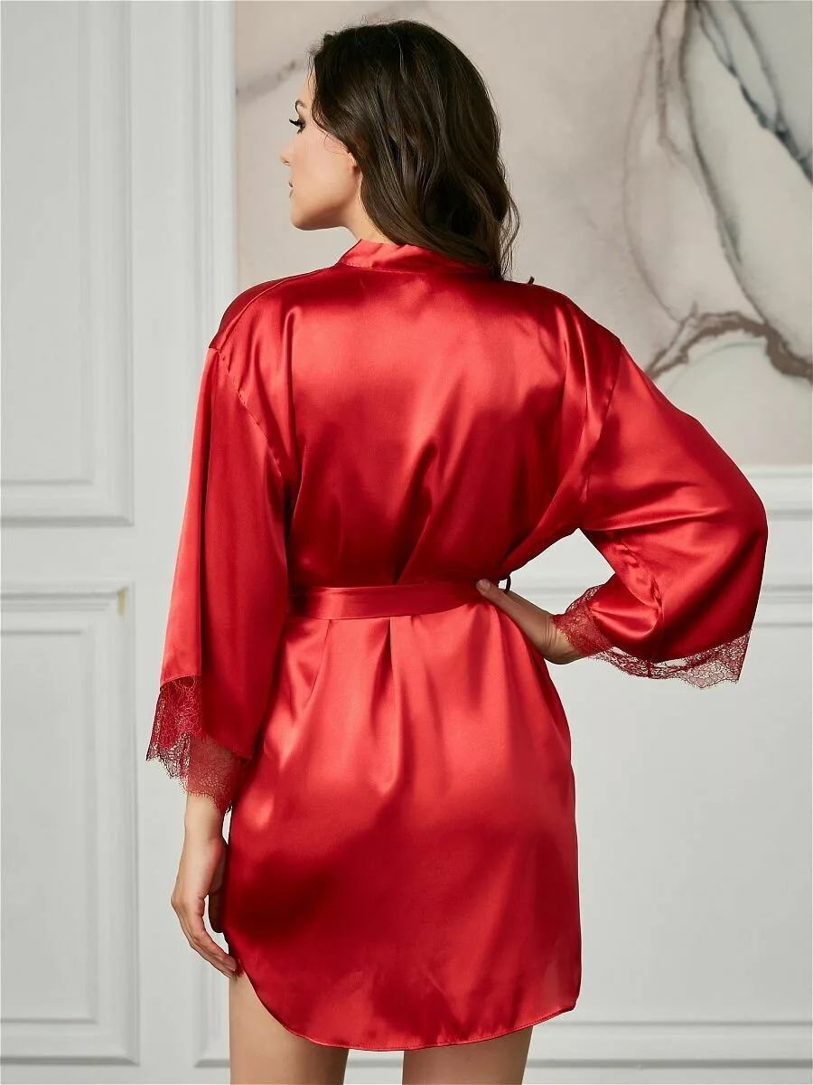 Короткий халат на запах из искусственного шелка с поясом, декорированный кружевом по рукаву.