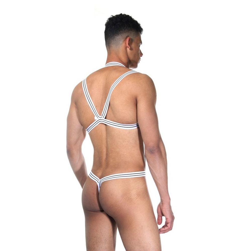 Сексуальное боди для мужчин. Бело-черные широкие резинки оплетают тело. Гульфик белого цвета из гладкого плотного материала.