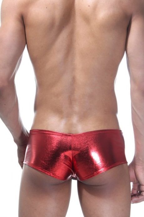 Мужские трусы-хипсы с низкой посадкой. Сделаны из красной яркой блестящей ткани, спереди мягкая вставка из клетчатой тонкой ткани.