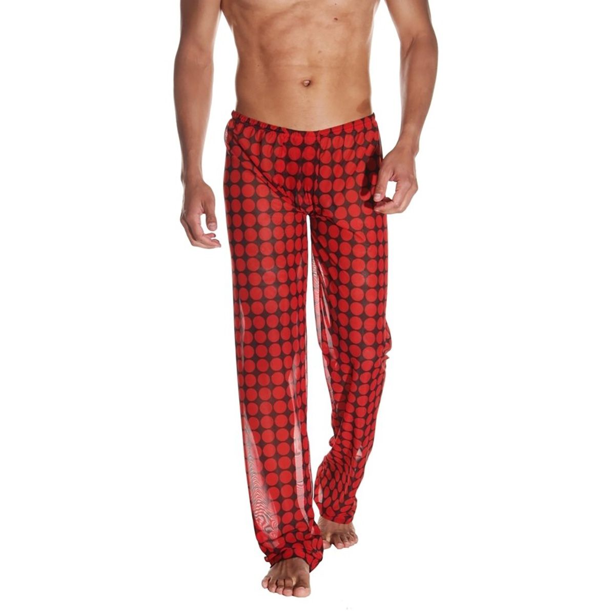 Свободные штаны из легкой полупрозрачной ткани в крупный красный горох.
