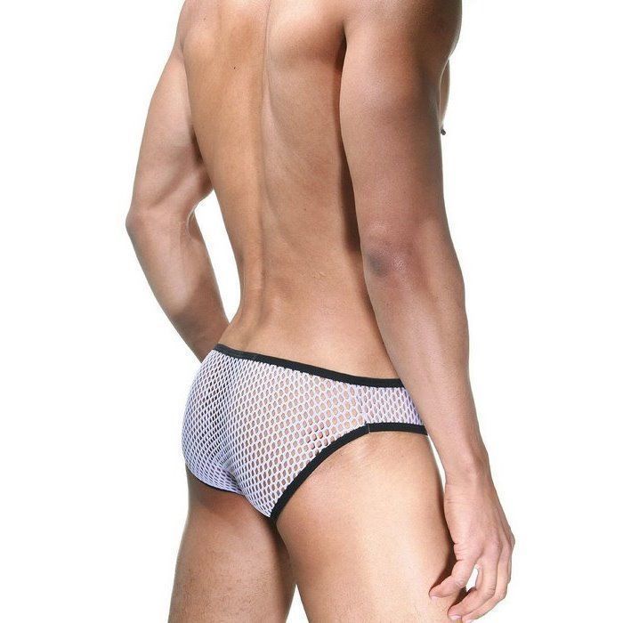 Мужские слипы с низкой посадкой, у которых задняя поверхность и боковые вставки сшиты из крупной сетки, гульфик из непрозрачной тянущейся ткани. Черным кантом обшита вся поверхность трусов.