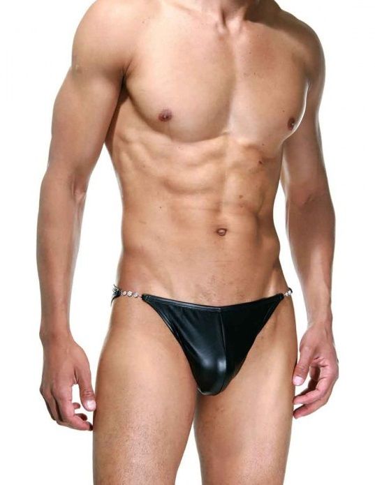 Гладкие черные мужские трусы-слипы, у которых по бокам вставлены красивые декоративные металлические элементы.