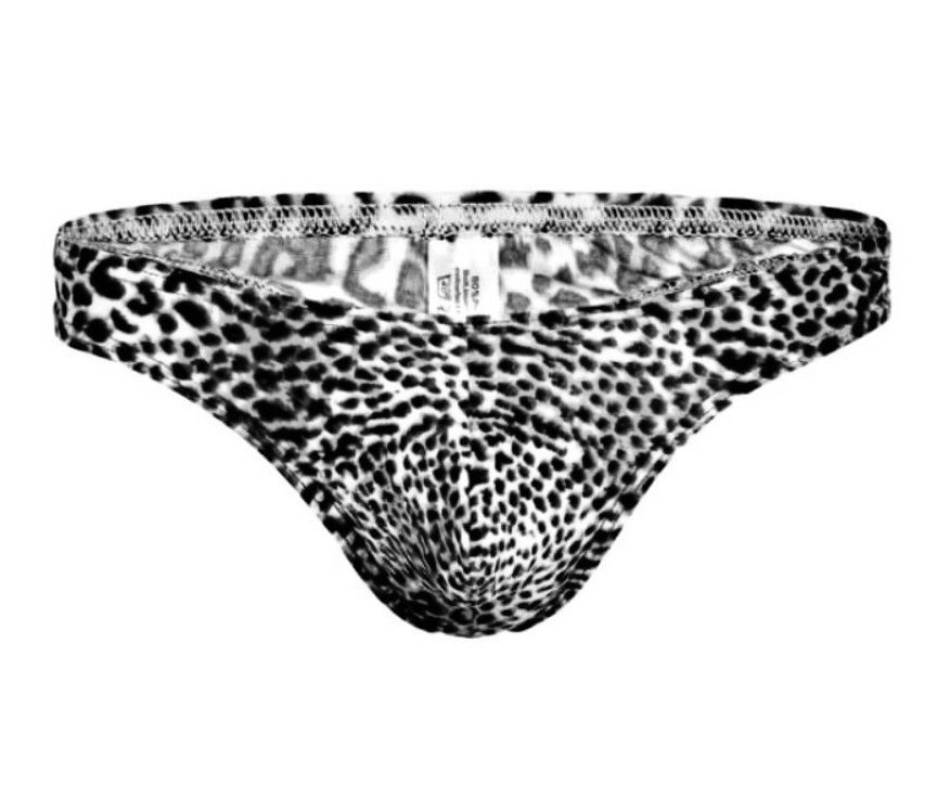 Мужские трусы-тонги с серым леопардовым принтом.
