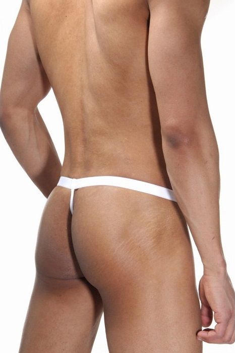 Мужские откровенные трусы в крупную синюю сетку. Трусы-стринги, на широкой белой резинке.