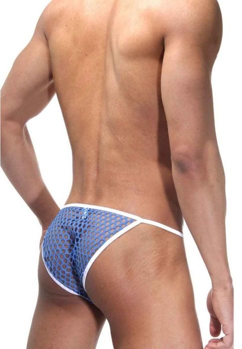Трусы-танга для мужчин, сшитые из тянущейся эластичной синей круглой сетки. Трусы на тонких белых резинках.