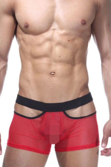 Откровенные трусы-боксеры из красной полупрозрачной ткани, с вырезом на интимном месте. Трусы на широкой черной резинке, с двумя небольшими вырезами по бокам.