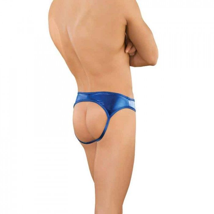 Слипы-джоки из гладкого, блестящего тянущегося материала. Трусы с низкой посадкой, ягодицы открыты.