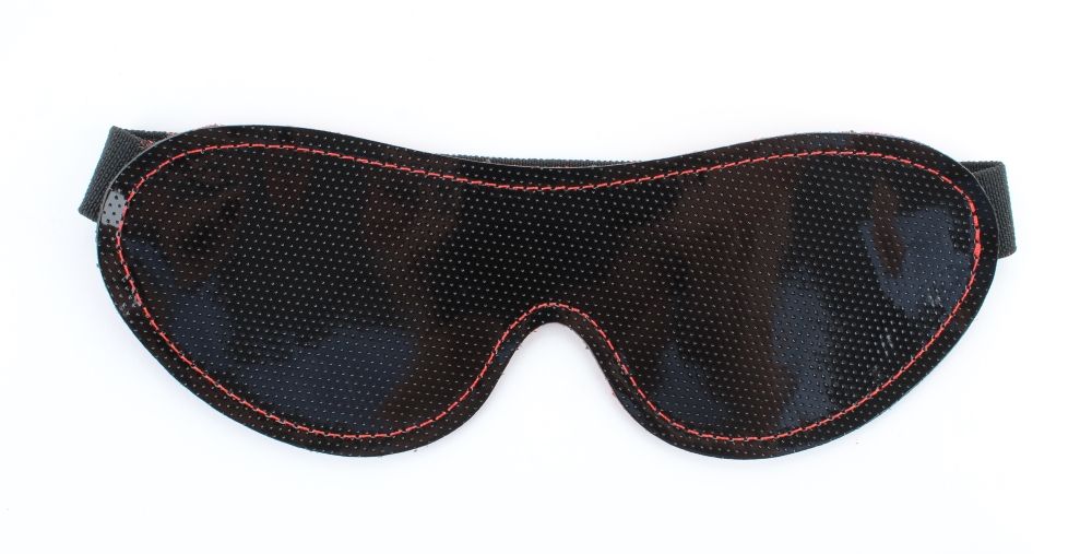 Чёрная перфорированная маска из кожи с красной строчкой.