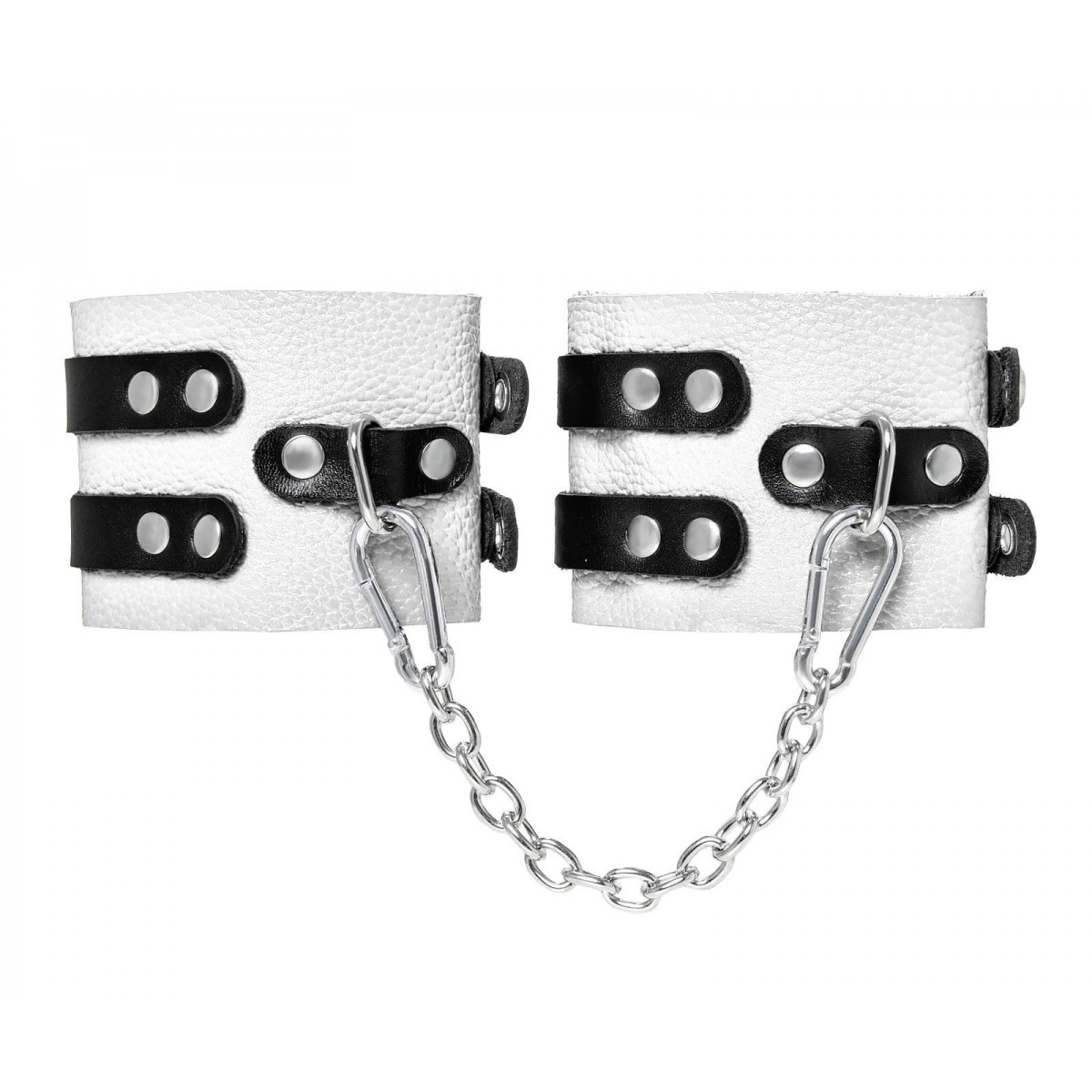 Мягкие оковы с двумя жёсткими ремешками от Pecado помогут обездвижить партнера во время сексуальных прелюдий или жестких БДСМ-играх. Оковы изготовлены полностью из белой, натуральной кожи. Ремешки выполнены из чёрной жёсткой кожи, украшены люверсами. Выделка материала произведена вручную. Ремешки и широкая манжета хорошо держат форму: не тянутся и не мнутся. Качественная металлическая фурнитура добавляет лоска изделию, а аромат натуральной кожи повышает градус возбуждения. Благодаря широкому запасу регулировок, можно подобрать необходимый обхват. Аксессуар удобно застегивать и легко расстегивать. При правильном использовании не оставляет следов на теле и не доставляет дискомфорта. Манжеты оков соединяются между собой помощью двух карабинов и съемной стальной цепочки. Подходит и для женских, и для мужских ног. Длина манжет - 25 см, ширина - 7 см. Длина сцепки - 20 см.