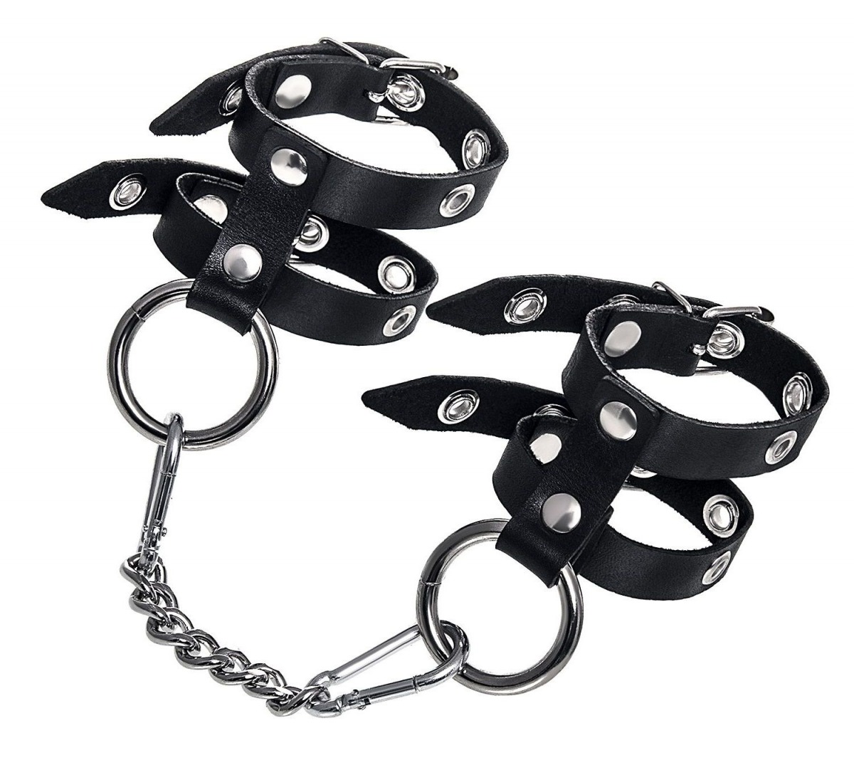 Однослойные кожаные наручники из двух ремешков могут стать стильным аксессуаром на «свободных» руках, но могут послужить вашим целям и фантазиям по своему прямому назначению. Наличие двух колец и карабинов, соединенных между собой металлической цепочкой, позволяет использовать изделие как раздельно – аксессуар-манжеты, так и как наручники для фиксации. К широким металлическим кольцам также можно присоединить и другие аксессуары при помощи карабинов. Благодаря универсальному размеру наручники могут использоваться и мужчинами, и женщинами. Размер легко регулируется с помощью металлических пряжек, органично вписывающихся в общий стиль. Длина манжет - 25 см, ширина ремешков - 1,6 см. Длина сцепки - 13 см.