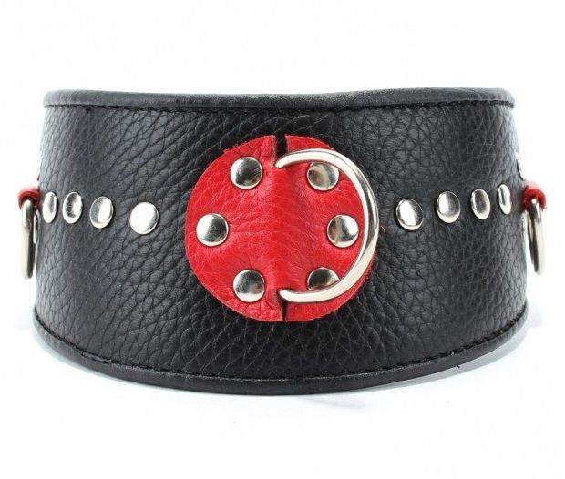 Изготовлен из натуральной кожи с металлическими заклепками. Размер универсальный. Кожаный ошейник - это один из основных атрибутов BDSM.