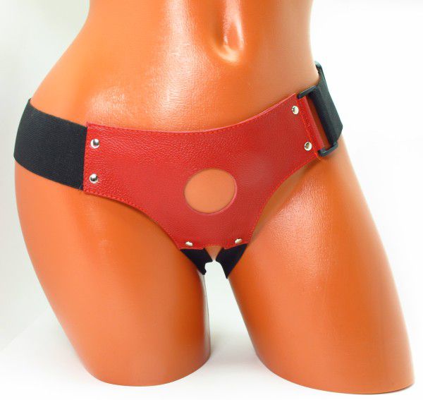 Красные кожаные трусики с отверстием для крепления страпона.