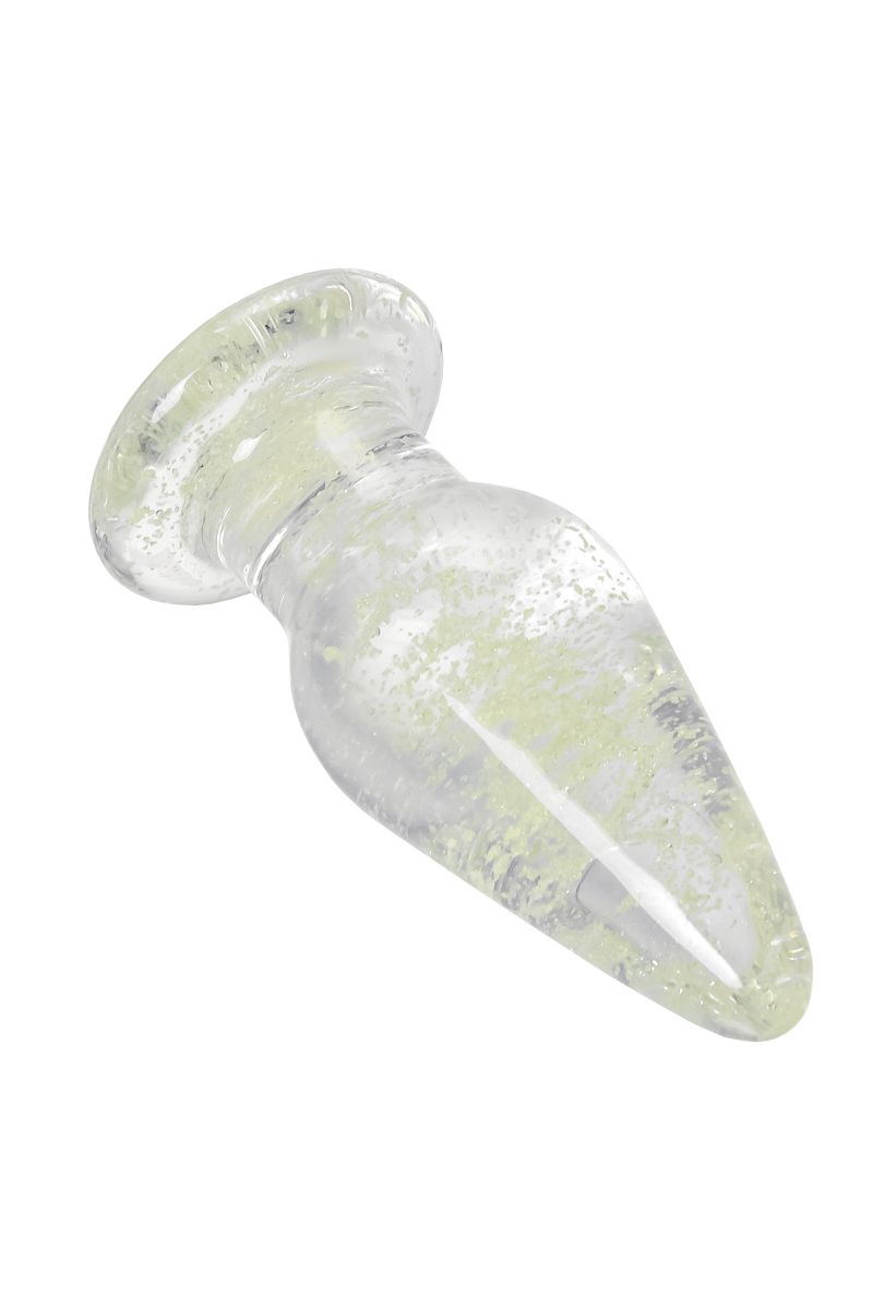 Прозрачная анальная втулка из закаленного стекла содержит флуоресцентные микрочастицы, которые светятся в темноте. Такой необычный дизайн помогает внести в интимные игры разнообразие. Достаточно зарядить игрушку под дневным или искусственным светом, чтобы насладиться ее мерцанием и свечением в темноте. Оптимальный размер, обтекаемая форма конуса и наличие ограничителя делают использование анальной игрушки безопасным.